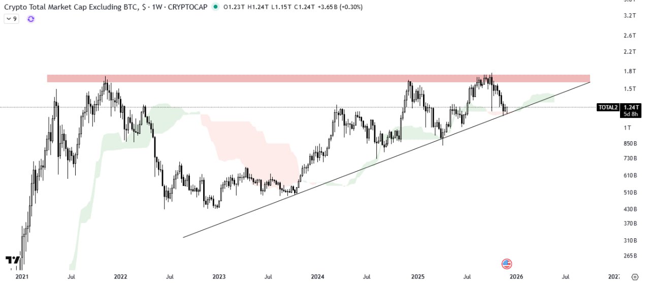The ALTS market cap is rebounding from the support trendline of the ascending triangle pattern, with the Ichimoku Cloud acting as strong support. If this level continues to hold, further upward movement is likely. Keep an eye on upcoming price action developments.