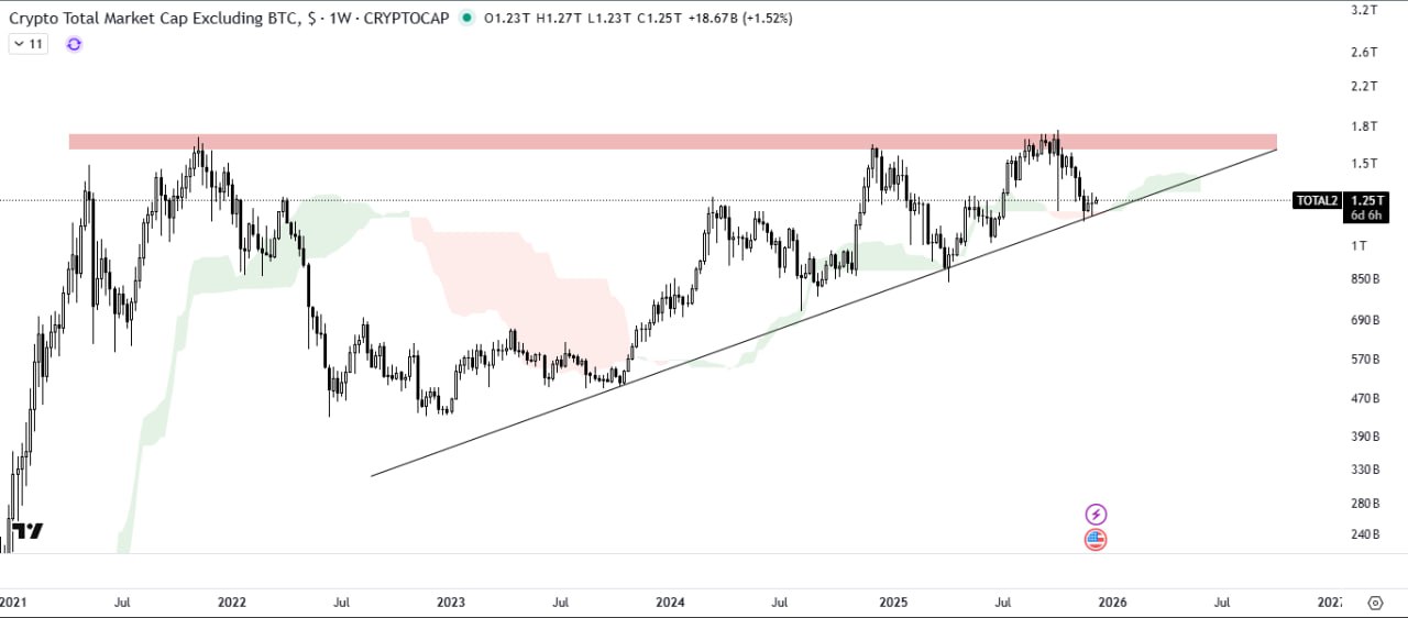 The ALTS market cap is holding above the support trendline of the ascending triangle pattern, with the Ichimoku Cloud acting as strong support.