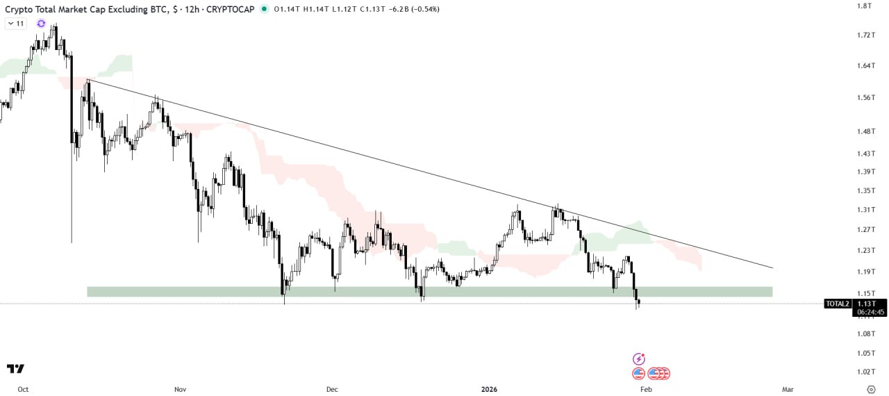 The altcoins market cap has broken down from the descending triangle pattern with significant volume.