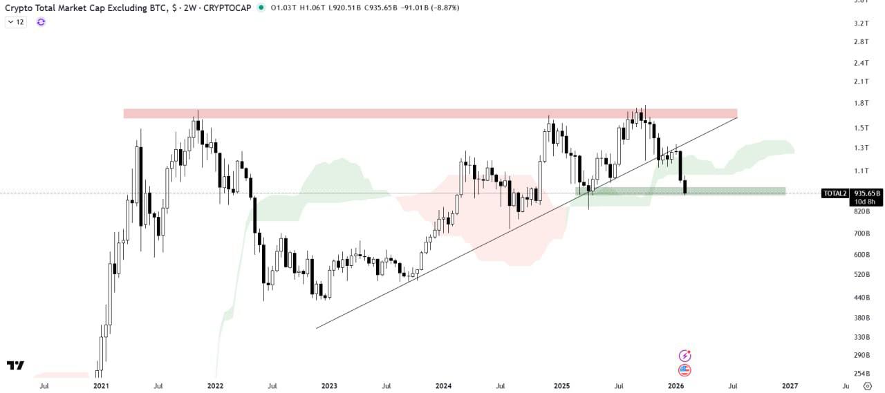 The altcoins market cap has broken down from the ascending triangle pattern and is currently trading within a horizontal demand zone.