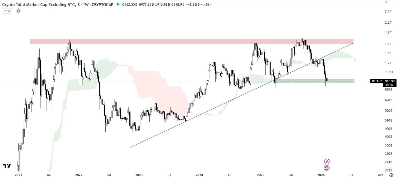 The altcoins market cap has broken down from the ascending triangle pattern and is currently trading within a horizontal demand zone.