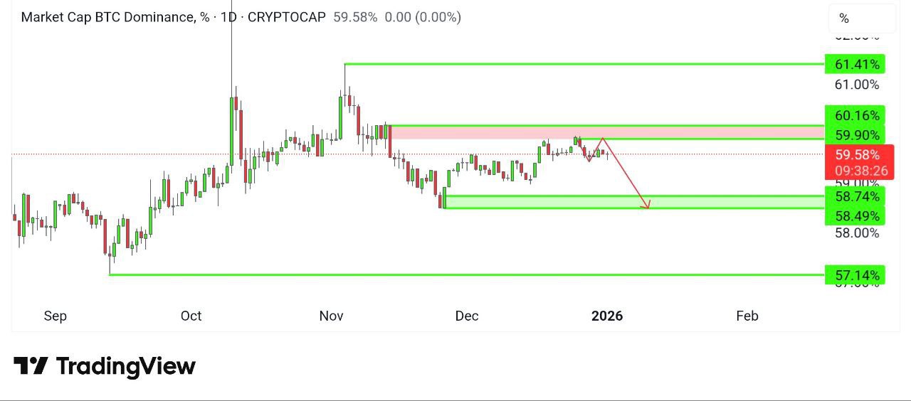 So far, nothing much has changed in the scenario. It s still below the demand zone of the 60 area. As long as it stays below that zone, we are expecting at 58 or below. In the meantime, we re expecting some momentum in alts too. This bias is valid as long as the demand zone sustains.