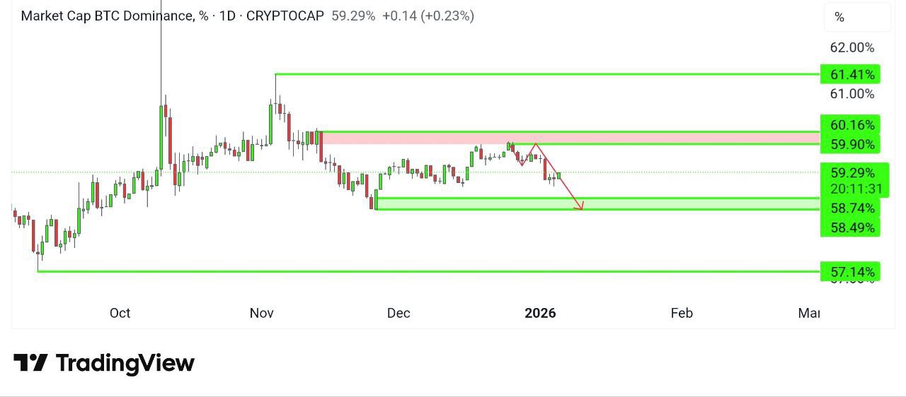 So far, is moving as expected. After hitting the resistance area of 60 , it started to retrace and nearly touched our mentioned zone of 58 . If the momentum continues, then we may see at 58 or below in the coming days. Meanwhile, we are expecting some momentum in alts too. This bias remains valid as long as it stays below the 60 area.