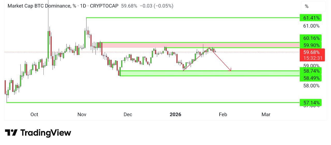 Bitcoin dominance is facing resistance at the 60 area and showing weakness. If this momentum continues, then we may see it at the 58 area in the coming days. If this happens, then we may also see some momentum in alts. This bias is valid as long as it stays below the 60 zone.
