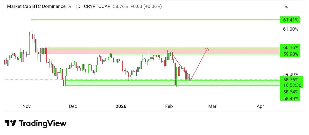 Bitcoin dominance is range bound between 58 and 60 area. It is currently at the lower end of this range at 58 and attempting to bounce back. If this momentum continues, it may reach the 60 range high in the coming days. This bias remains valid as long as it holds the 58 range low.