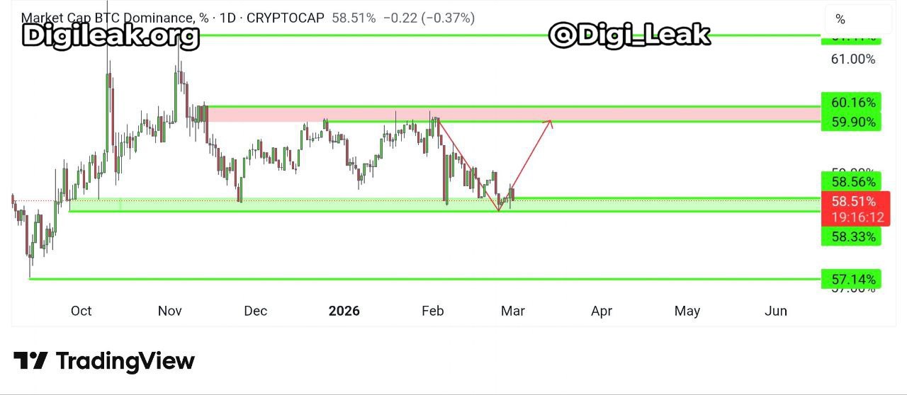 Bitcoin dominance is range bounded between the 58 and 60 area. Currently, is at the lower end of this range. As long as the 58 area holds, we may see it reach the 60 area in the coming days. This bias is valid till the lower zone holds. However, if it fails to sustain then we may see it at 57 or lower levels.