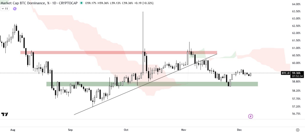 BTC Dominance is currently rebounding above the horizontal S R zone, showing that buyers are still defending this key level.