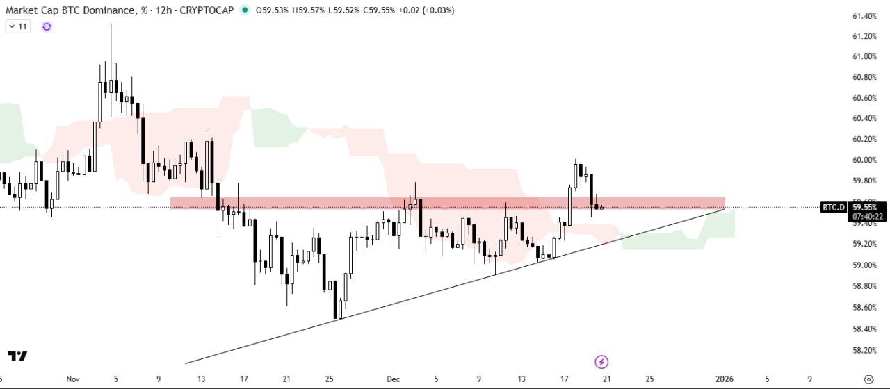 BTC Dominance has broken out of the ascending triangle pattern with significant volume and is currently retesting the breakout level. The Ichimoku Cloud is acting as support.
