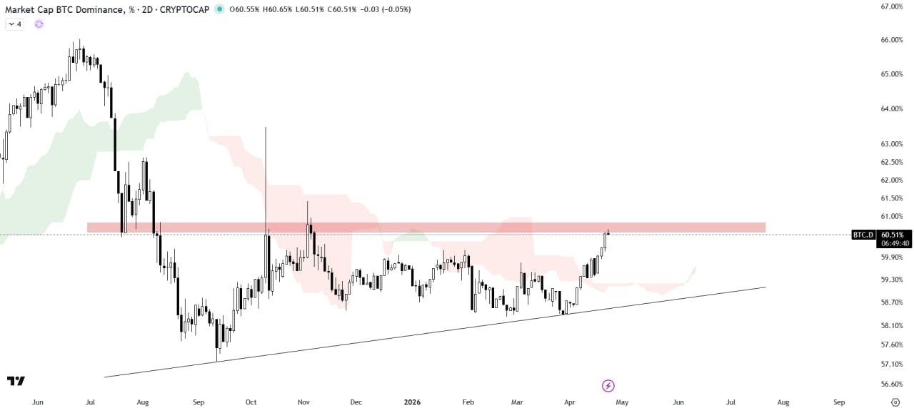 Bitcoin Dominance is facing rejection from the horizontal supply zone of an ascending triangle pattern, with the Ichimoku Cloud acting as a support indicating underlying strength.
