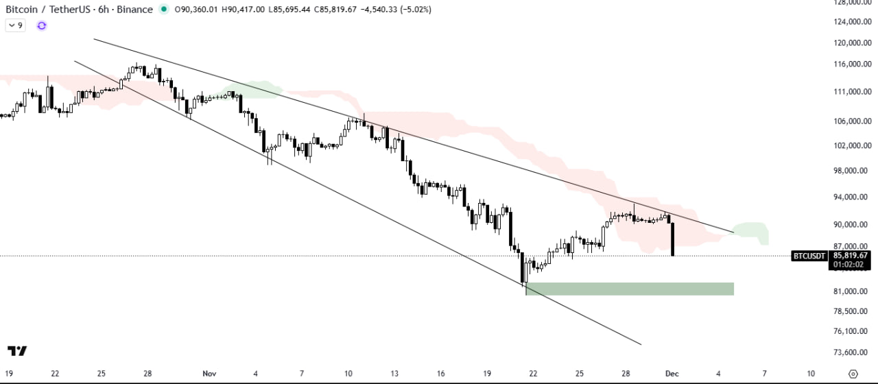 Bitcoin is facing rejection at the resistance trendline of the descending broadening wedge. The Ichimoku Cloud is acting as a resistance barrier above the price action.