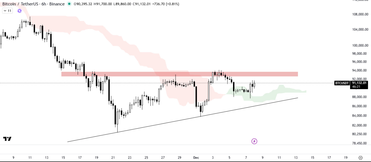 Bitcoin is consolidating within an ascending triangle pattern and is currently rebounding from the Ichimoku Cloud, which is acting as strong support.