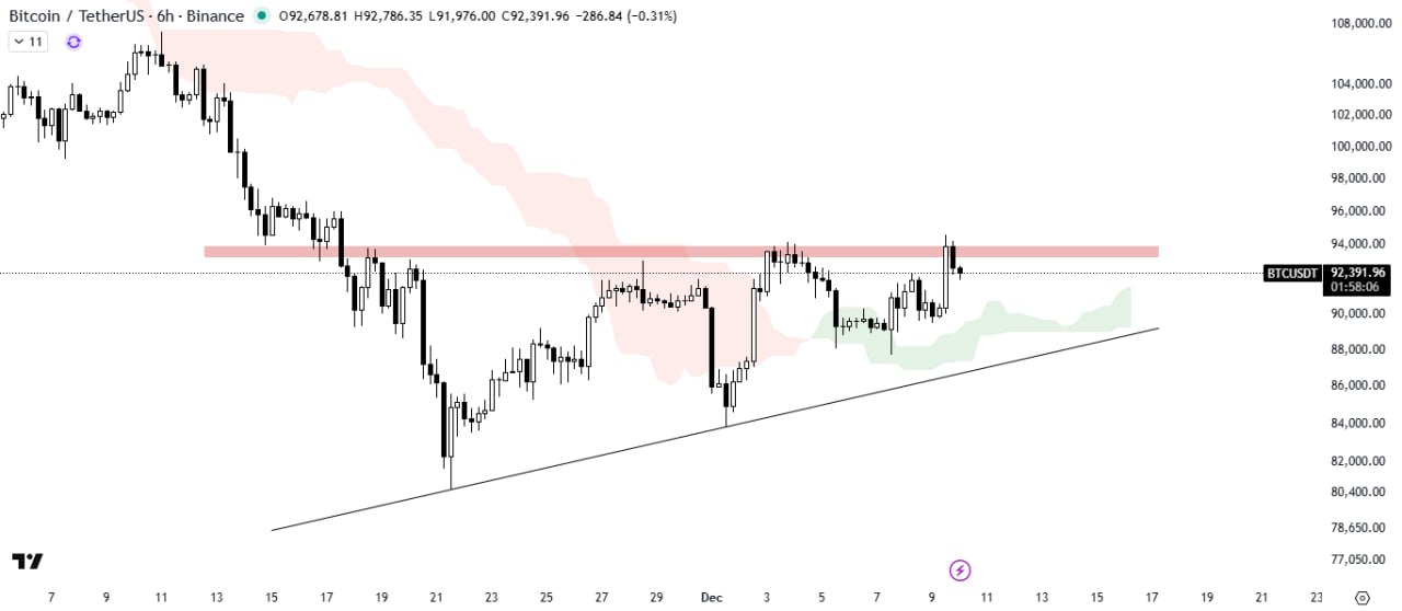 Bitcoin is facing rejection from the horizontal supply zone of the ascending triangle pattern. The Ichimoku Cloud is acting as support, showing underlying strength.