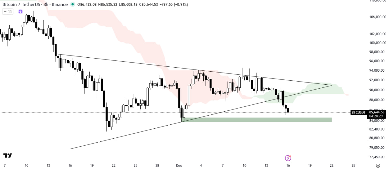 Bitcoin has broken down from the symmetrical triangle pattern and is currently trading above a key horizontal demand zone.