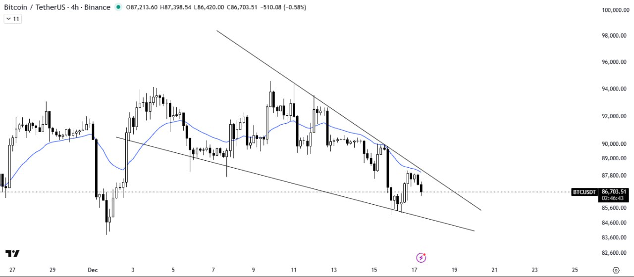 Bitcoin is consolidating within a falling wedge pattern and is currently facing rejection from the 21MA, which is acting as a resistance barrier above the price action.