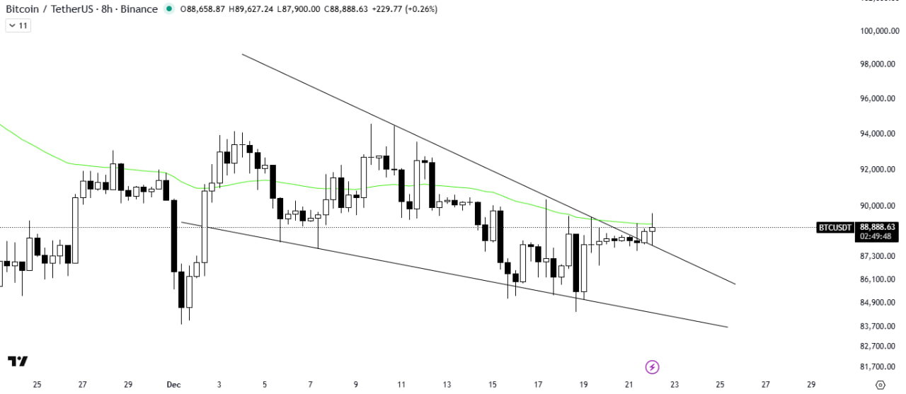 Bitcoin has broken out of the falling wedge pattern with significant volume and is now attempting to break above the 50MA, which is acting as resistance. A successful breakout above the 50MA would signal a bullish rally in the market.