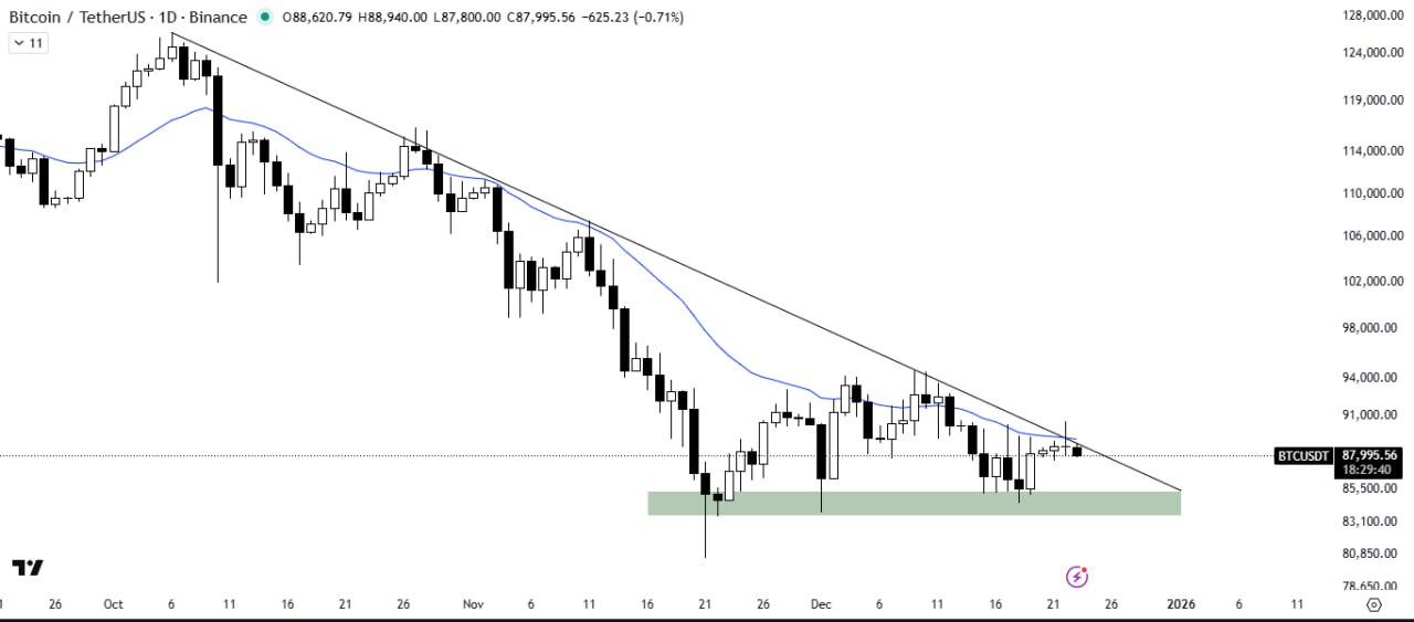 A breakout above the trendline or a breakdown of the demand zone will confirm the next directional move.