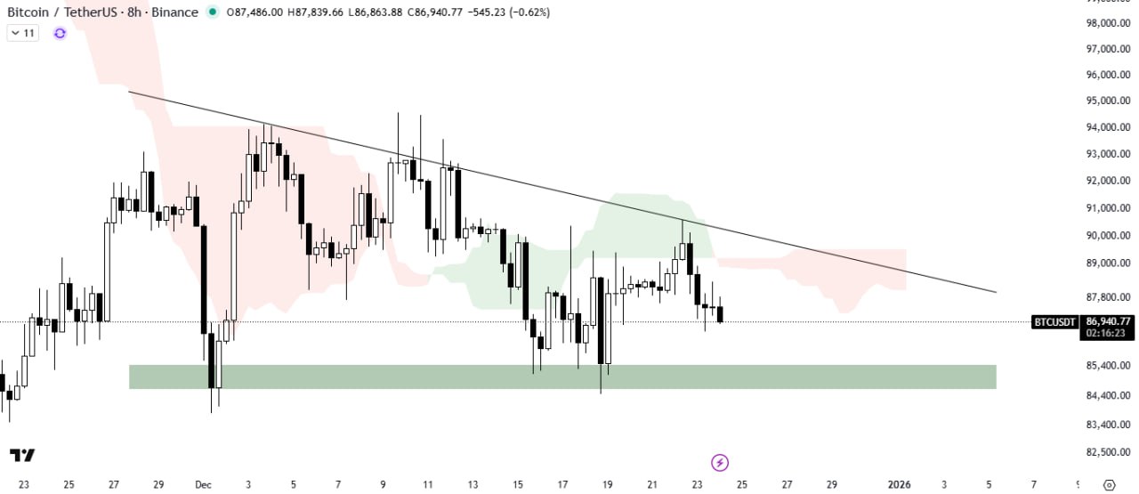 Bitcoin is consolidating within a descending triangle pattern and is currently facing rejection from the resistance trendline, with the Ichimoku Cloud acting as a resistance barrier. A confirmed breakout or breakdown is needed to determine the next directional move.