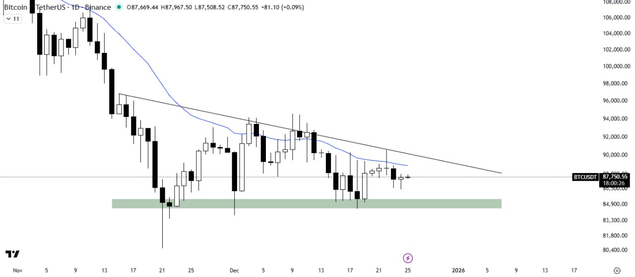 Bitcoin is consolidating within a descending triangle pattern and is currently trading below the 21MA, which is acting as a resistance barrier. A solid breakout or breakdown is needed to confirm the next directional move.