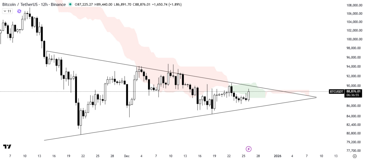Bitcoin is consolidating within a symmetrical triangle pattern and is currently trading below the resistance trendline while remaining inside the Ichimoku Cloud. A solid breakout or breakdown of the triangle is needed to confirm the next directional move.