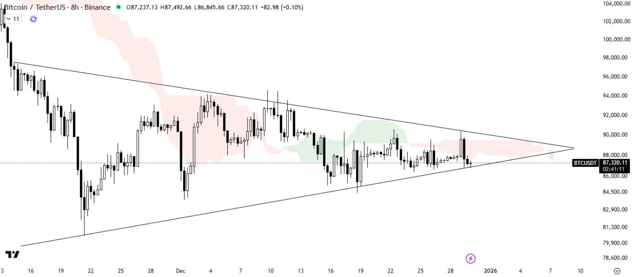 Bitcoin is consolidating within a symmetrical triangle pattern and is currently holding above the support trendline. The Ichimoku Cloud remains a strong resistance barrier overhead.