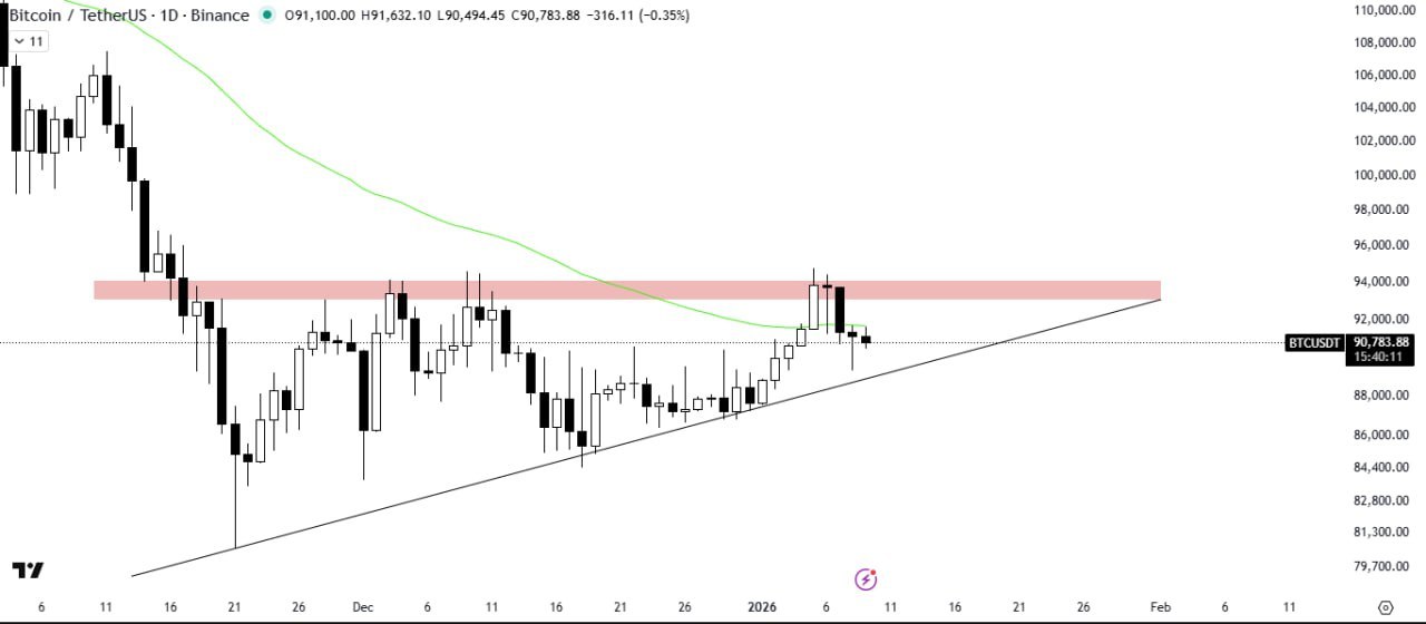 Bitcoin is facing rejection from the horizontal supply zone of the ascending triangle pattern. The 50MA is acting as a resistance barrier above the current price action. A confirmed breakout or breakdown is needed to determine the next directional move.