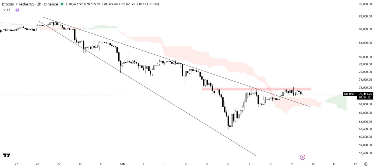Bitcoin is facing rejection from the horizontal supply zone following the breakout of the descending broadening wedge pattern. The Ichimoku Cloud is acting as support.