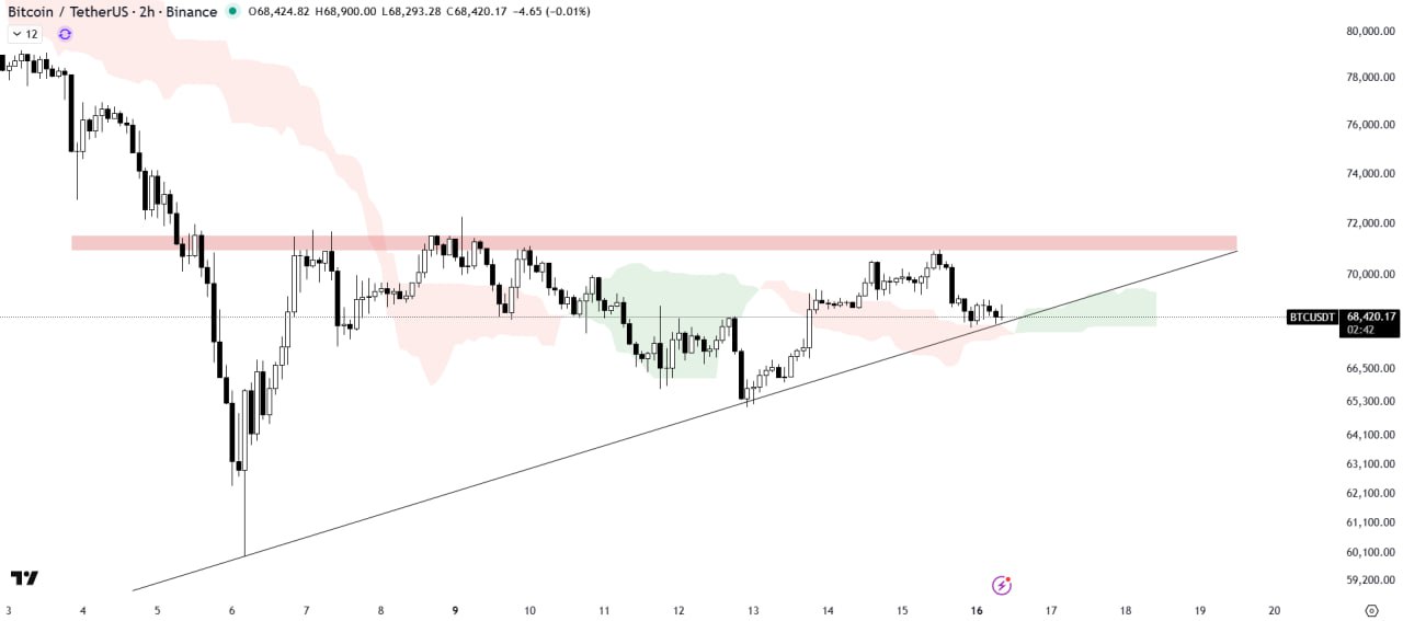 Bitcoin is consolidating within an ascending triangle pattern and is currently trading above the support trendline. The Ichimoku Cloud is acting as support, indicating strength.