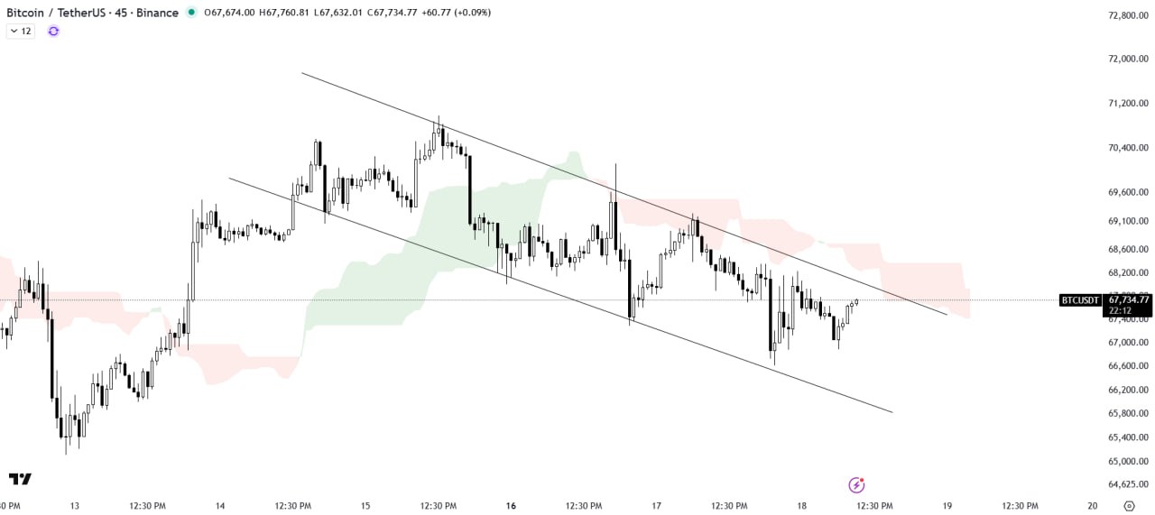 Bitcoin is consolidating within a descending channel and is currently trading below the channel s resistance trendline. The Ichimoku Cloud is acting as a resistance barrier above the channel.