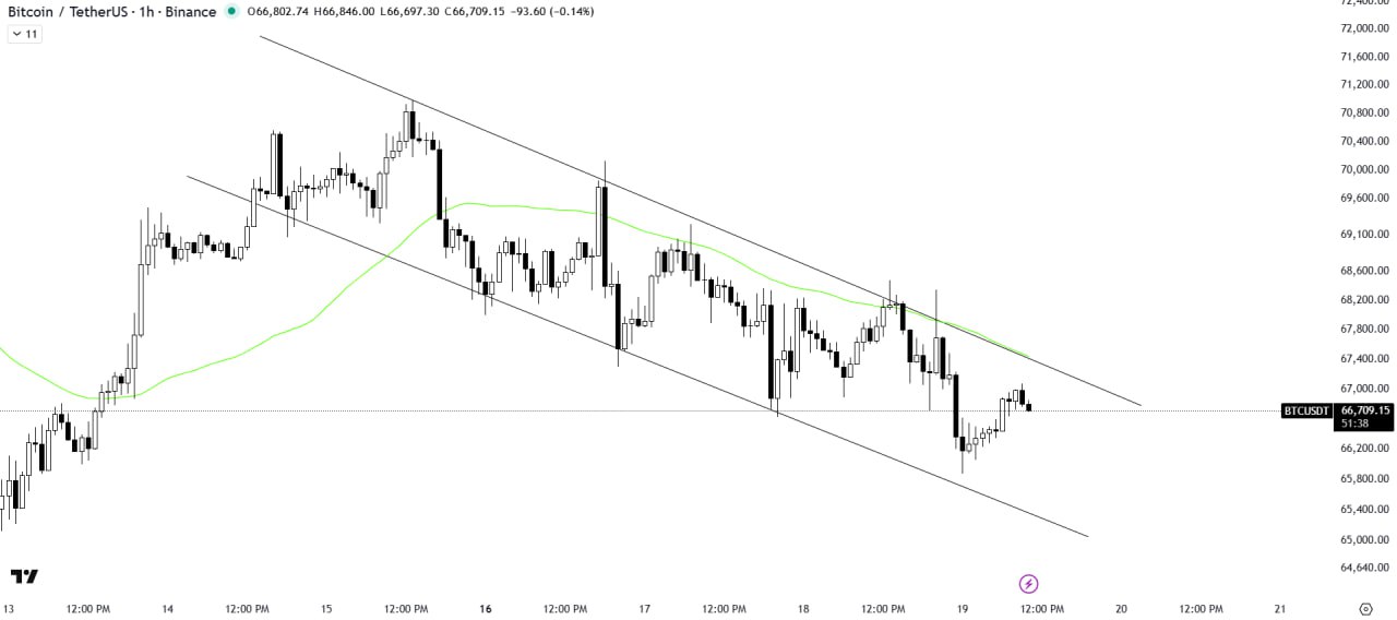 Bitcoin is consolidating within a descending channel and is currently trading below the channel s resistance trendline, where the 50MA is acting as a resistance barrier.