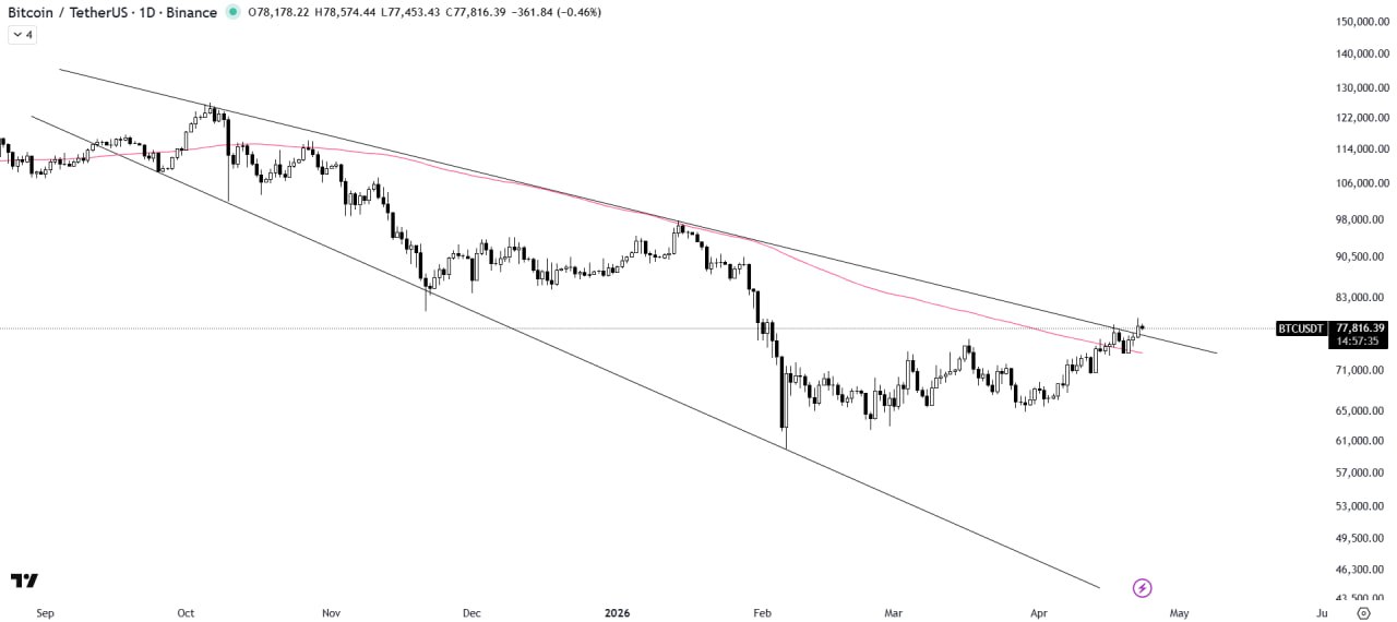 Bitcoin has broken out of the descending broadening wedge pattern and is currently undergoing a retest of the breakout level. The 100MA is acting as a support, indicating underlying strength.