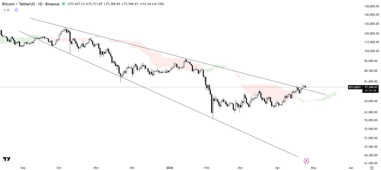 Bitcoin has broken out of the descending broadening wedge pattern with strong volume confirmation and is now undergoing a retest of the breakout level.