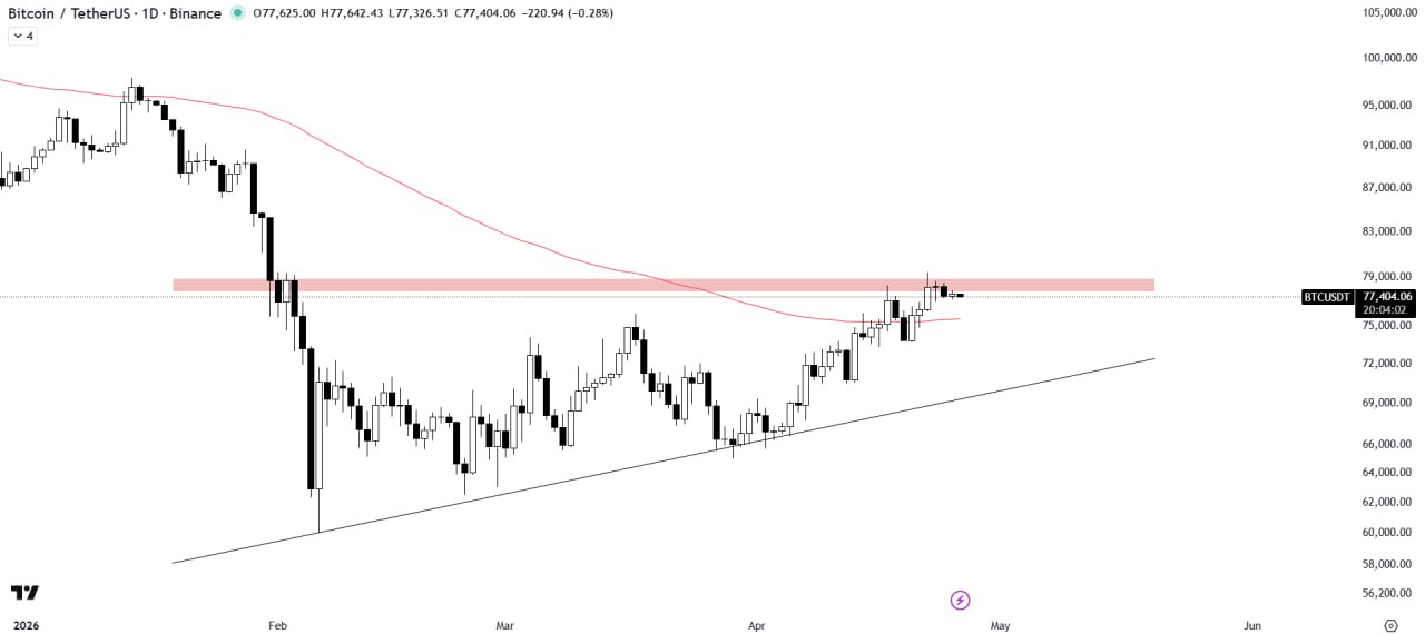 Bitcoin is facing rejection from the horizontal supply zone of an ascending triangle pattern, while the 100MA is acting as immediate support below the current price.
