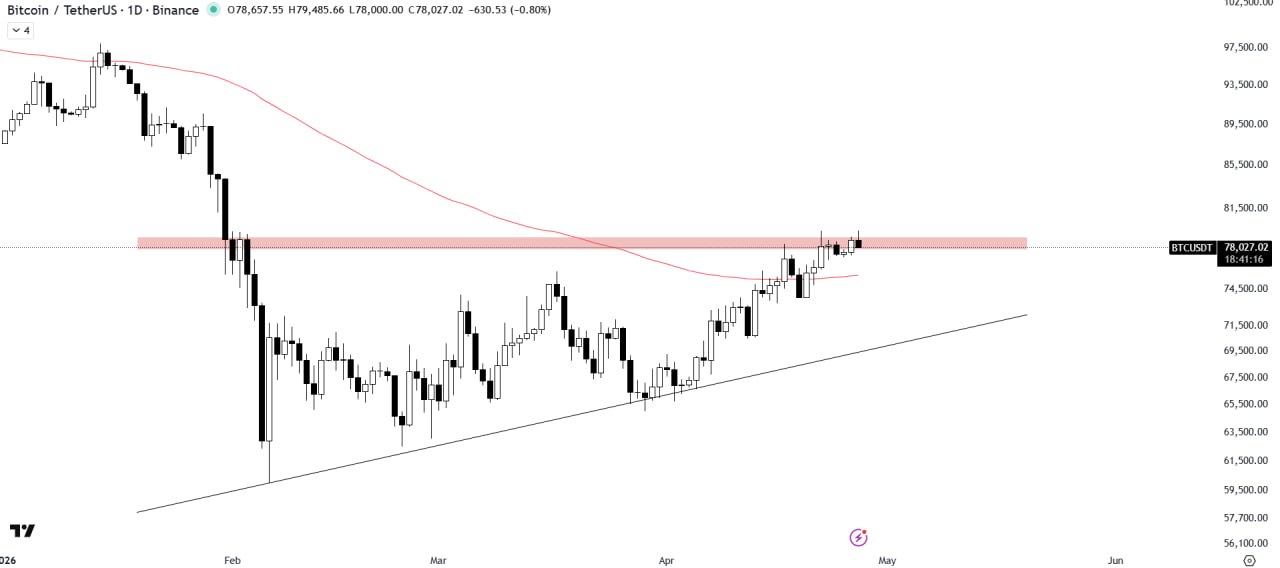 Bitcoin is trading within the horizontal supply zone of an ascending triangle pattern, while the 100MA is acting as a support beneath the current price.