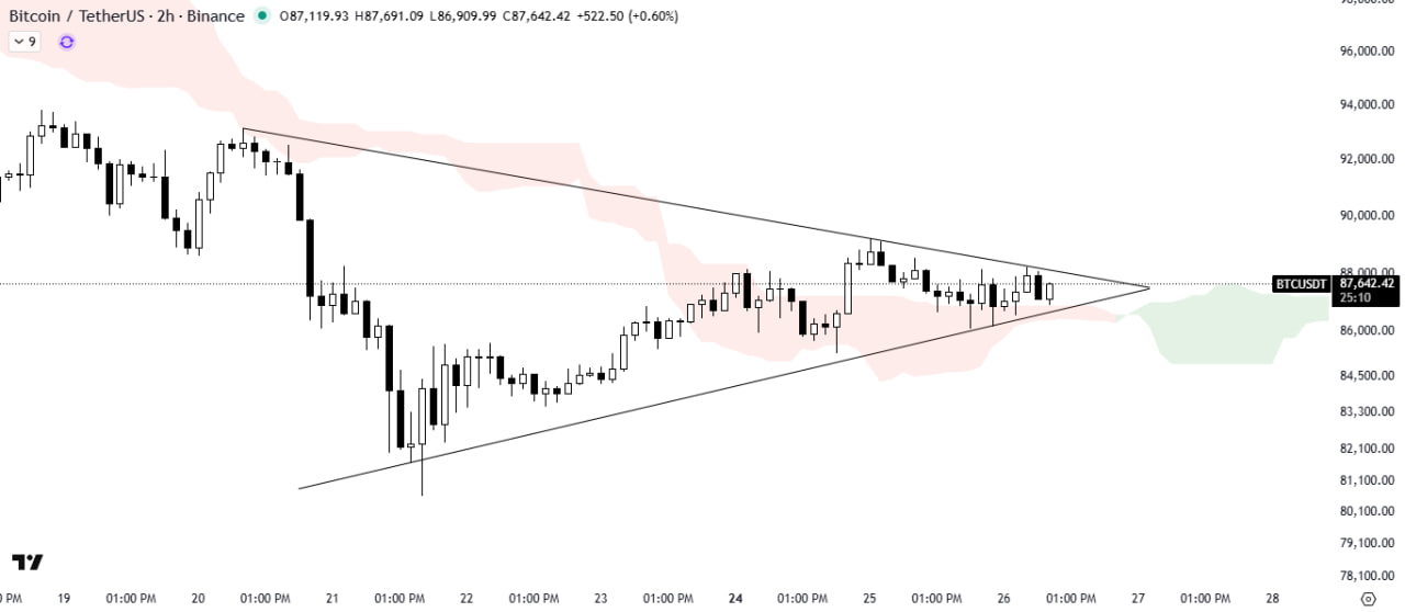 Bitcoin is consolidating within a symmetrical triangle pattern, currently trading above the support trendline.