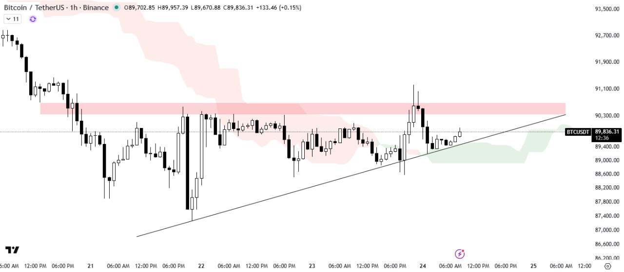 Bitcoin is rebounding from the support trendline of the ascending triangle pattern, with the Ichimoku Cloud acting as support and indicating strength.