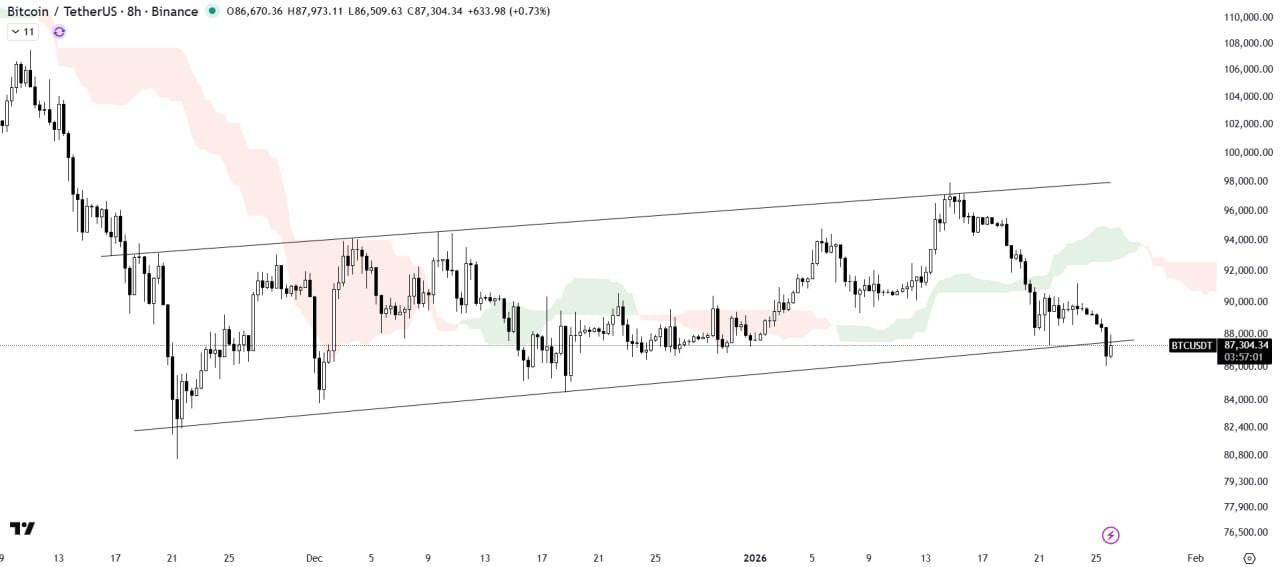 Bitcoin has broken down from the ascending channel with significant volume and is currently retesting the breakdown level.