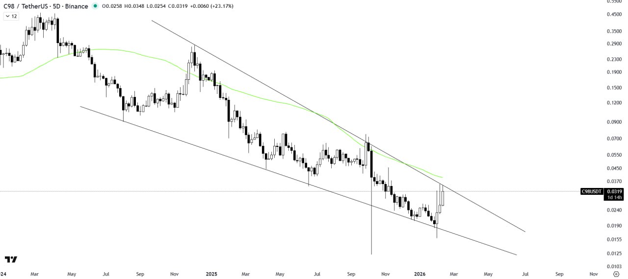 C98 is rebounding from the support trendline of the falling wedge pattern and is currently trading below the resistance trendline.