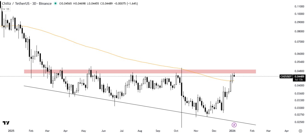 CHZ is facing rejection from the horizontal supply zone, while the 100MA is acting as support.
