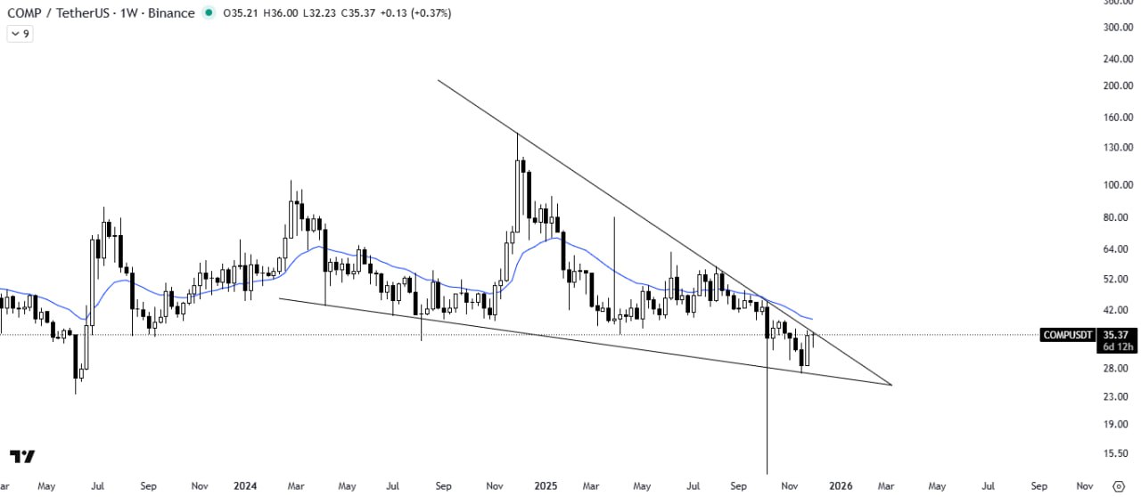 COMP is rebounding from the support trendline of a falling wedge, while the 21MA acts as near-term resistance.