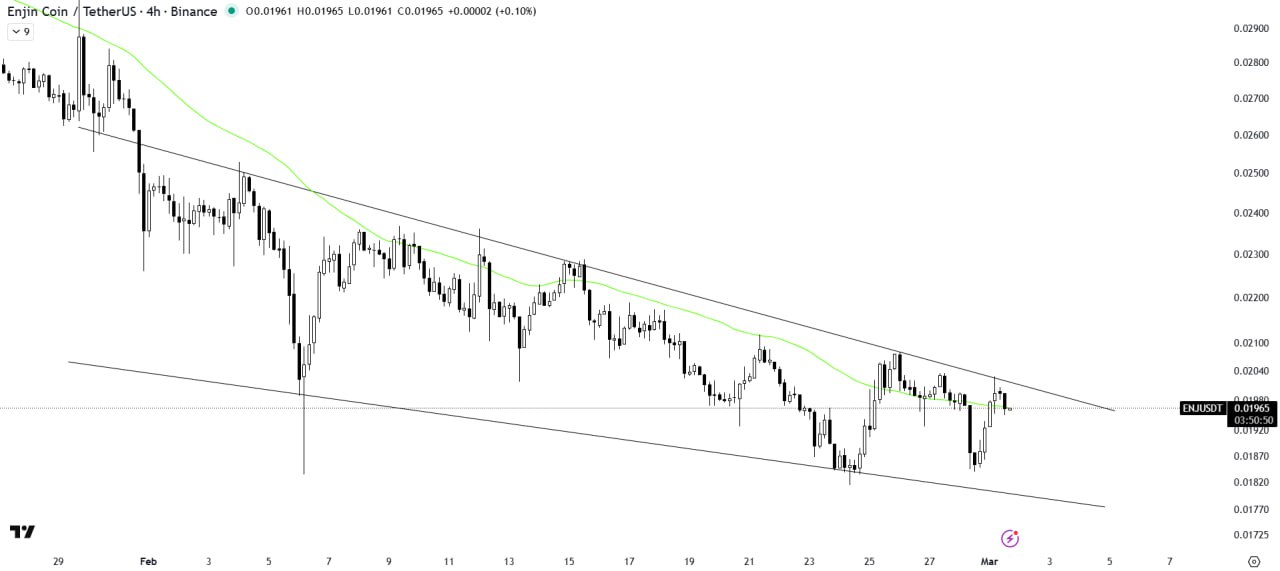 ENJ is currently consolidating within a falling wedge pattern and trading below the wedge s resistance trendline. The 50MA is also acting as a strong resistance barrier.