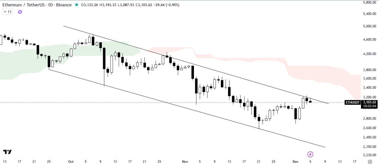 ETH is consolidating inside the descending channel and facing rejection from the resistance trendline while the Ichimoku Cloud acts as a resistance barrier.