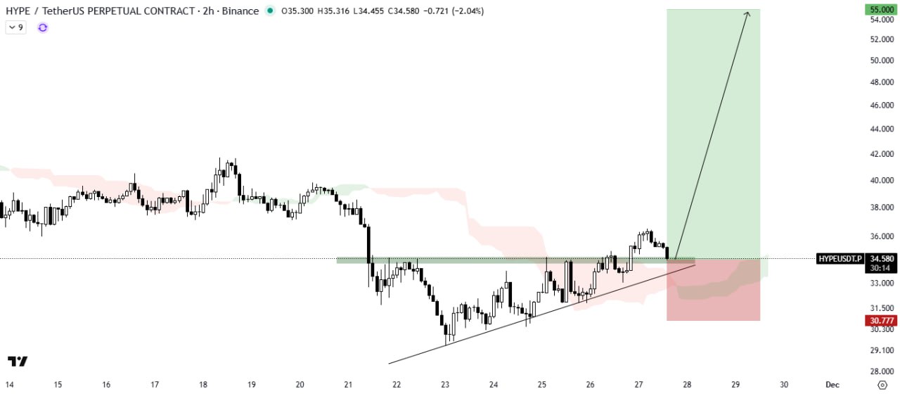 HYPE has broken out of an ascending triangle and is currently testing the breakout level. The Ichimoku Cloud is providing strong support, reflecting bullish strength. A successful test of the breakout zone could trigger a solid bullish rally.