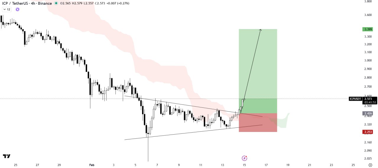 ICP has broken out of the symmetrical triangle pattern with significant volume. The Ichimoku Cloud is acting as support, indicating strength. The setup suggests potential for a strong upward move.
