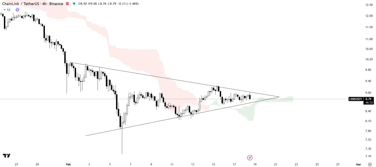LINK is consolidating within a symmetrical triangle pattern and is currently facing rejection from the triangle s resistance trendline.
