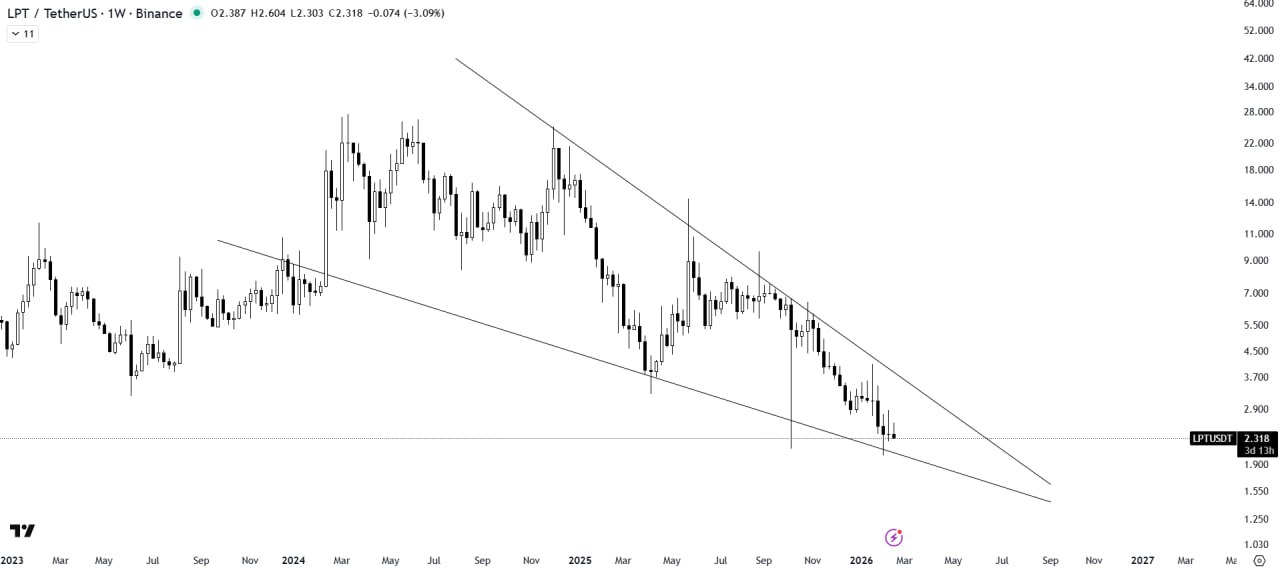 LPT is consolidating within a falling wedge pattern and is currently trading above the support trendline.