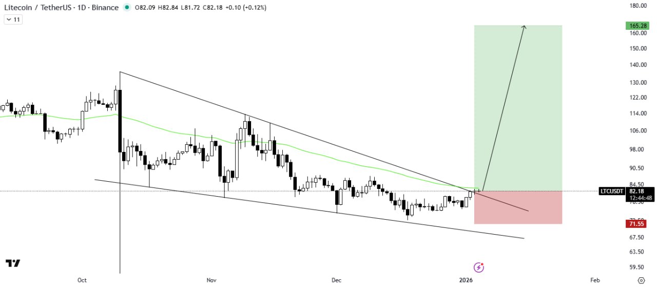 LTC has broken out of the falling wedge pattern and is currently testing the breakout level. The 50MA is acting as a resistance barrier above the current price action. A successful retest of the wedge, followed by a breakout above the 50MA, would confirm a strong bullish rally.