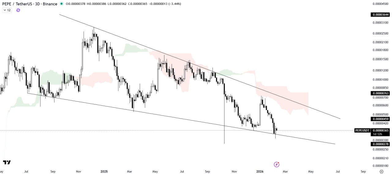 PEPE is rebounding from the support trendline of the falling wedge pattern, with the Ichimoku Cloud acting as a resistance barrier.