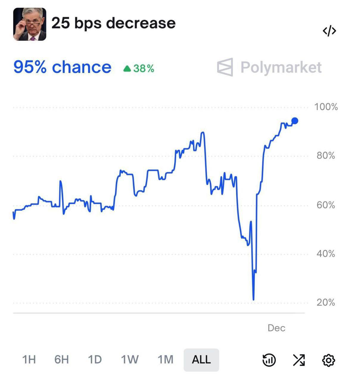 Polymarket gives a 95 chance that the Fed cuts rates by 25 bps today