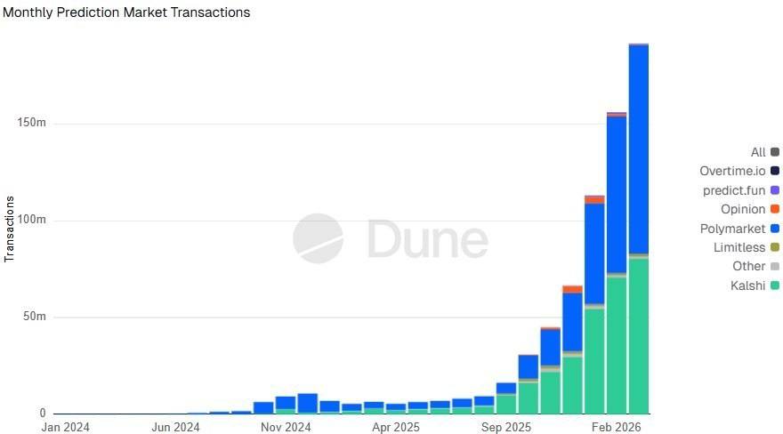 Activity on prediction platforms has surged, with 191M transactions in March a massive 2,838 YoY increase.