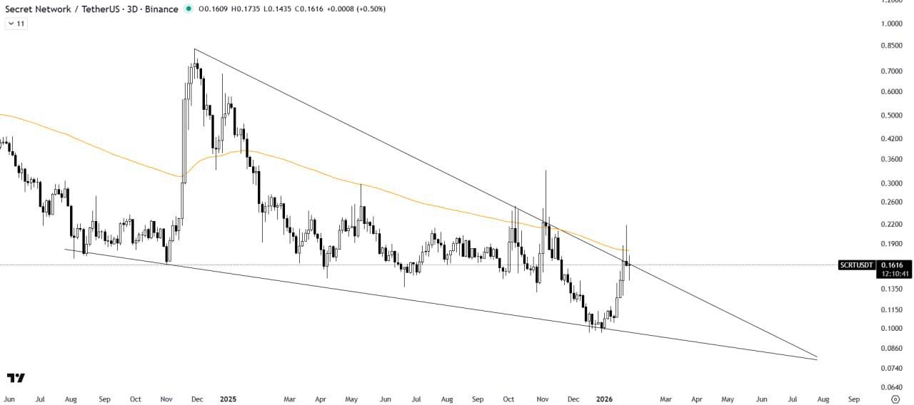 SCRT is rebounding from the support trendline of the falling wedge pattern and is currently attempting to break above the resistance trendline.